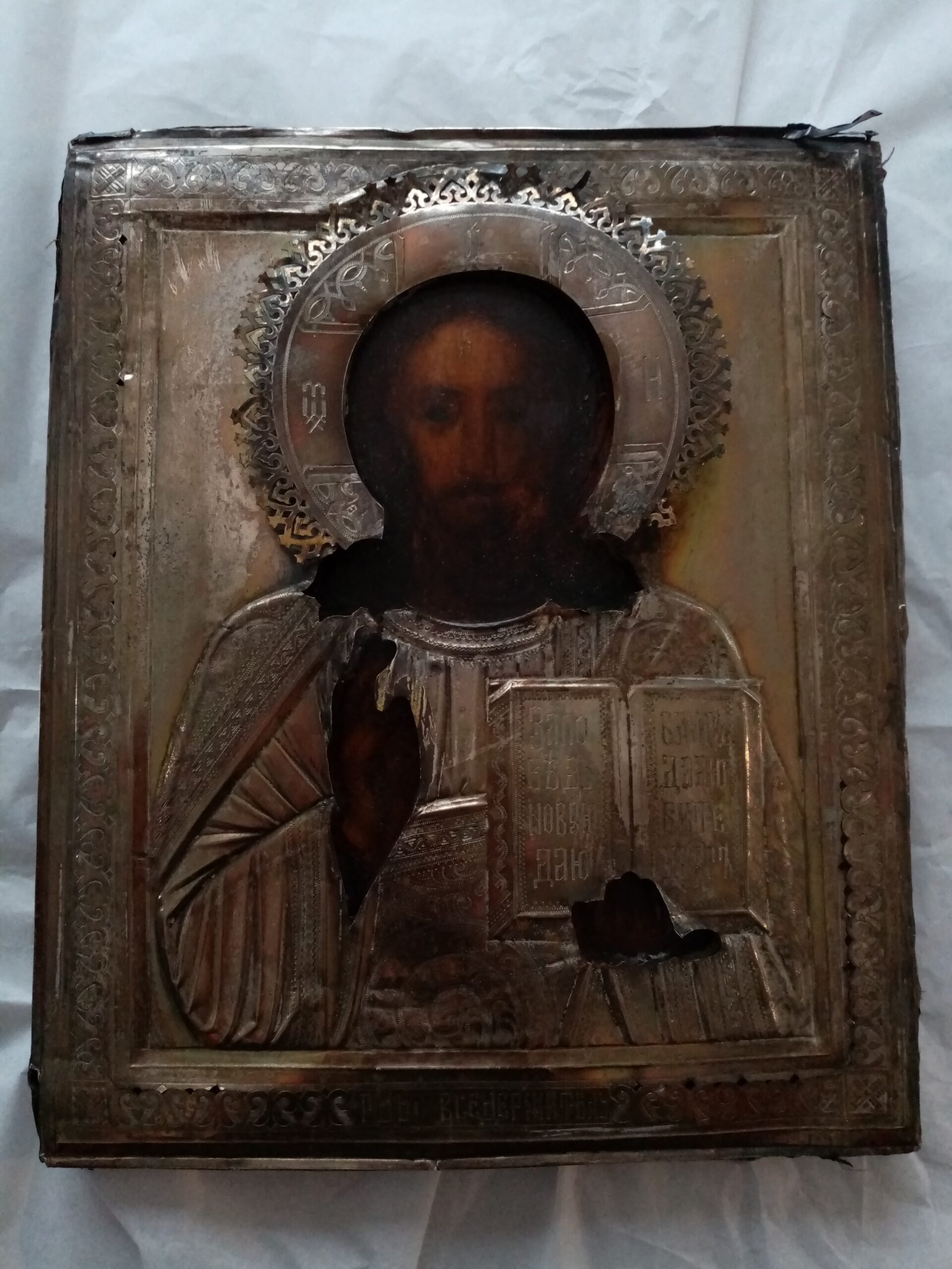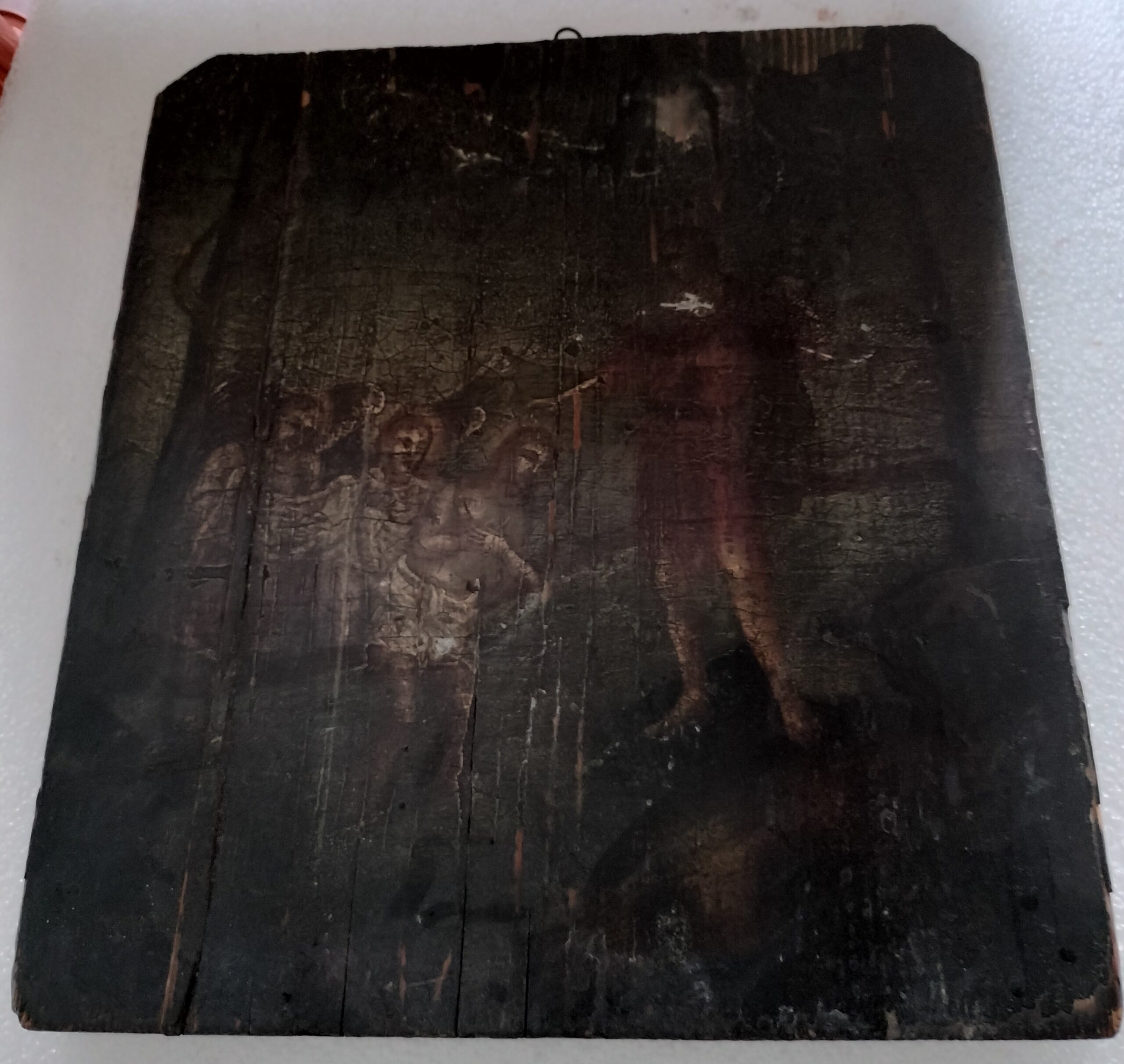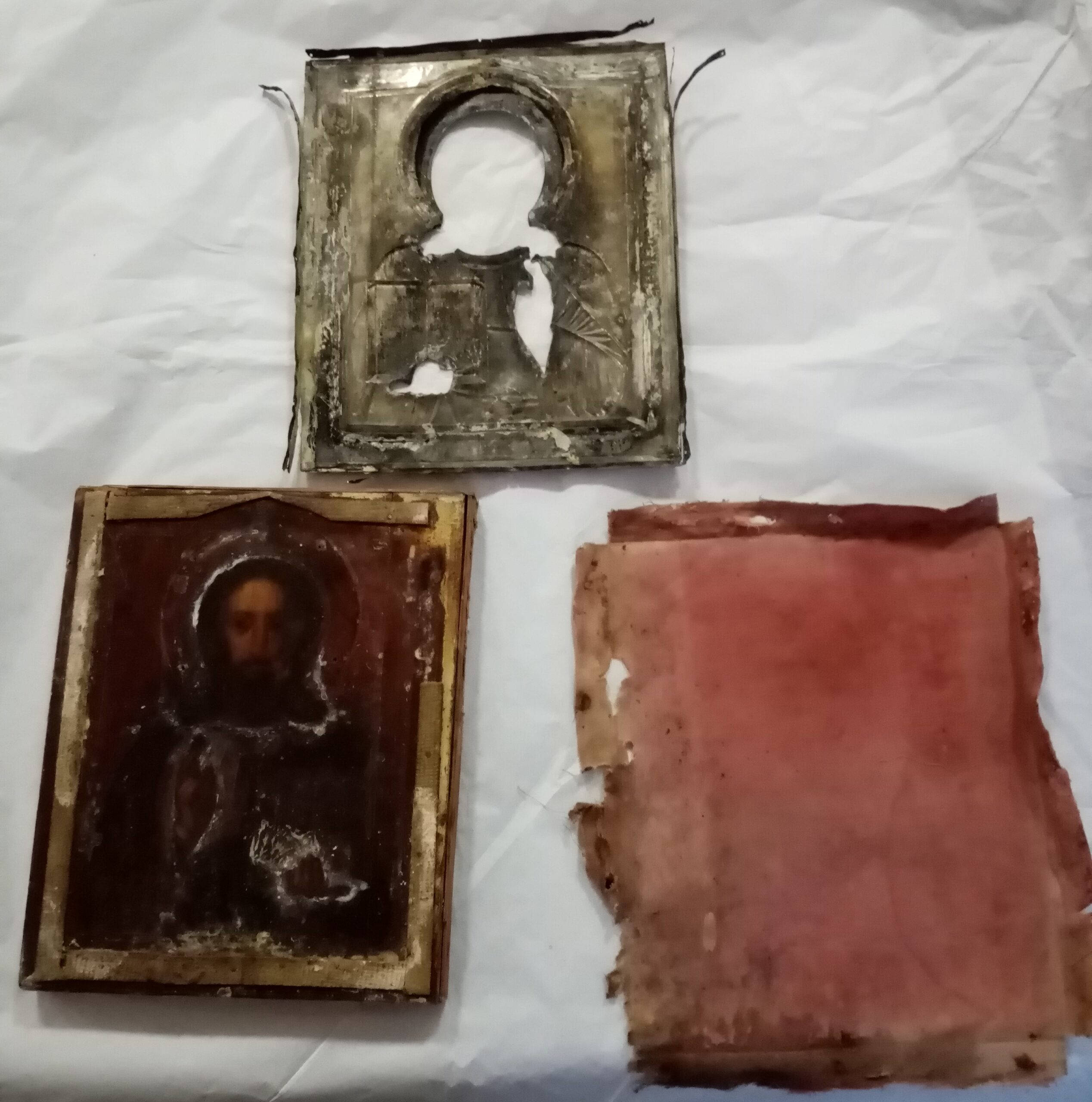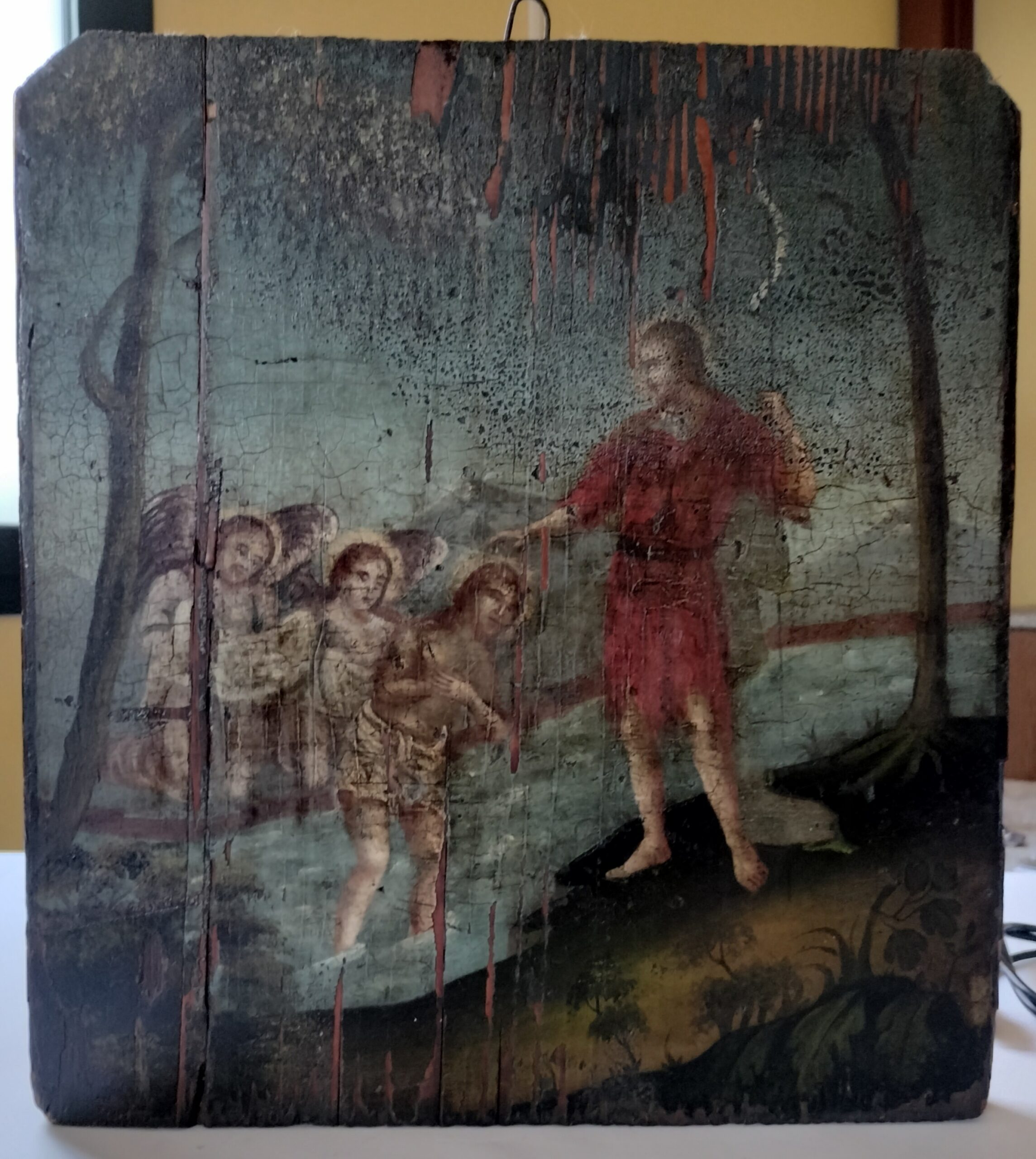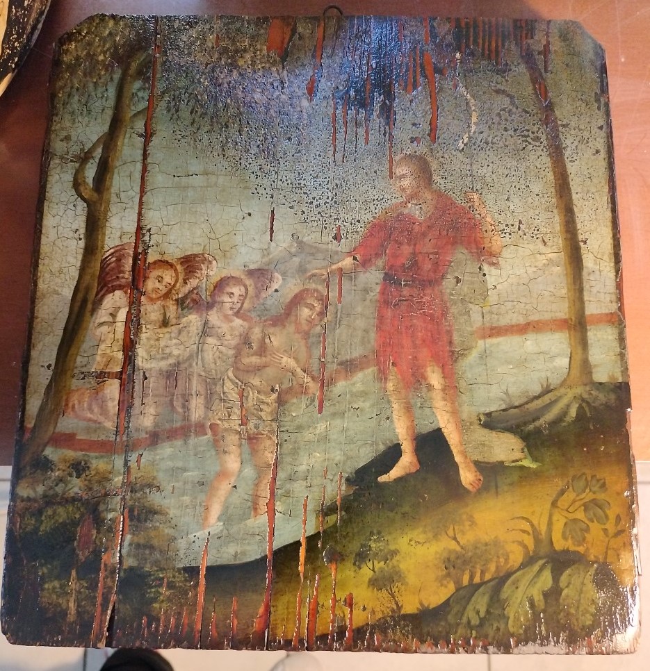 L’icona è stata vittima di un incendio e presentava le casistiche di degrado tipiche della combustione: annerimento pellicola pittorica (alterazione cromatica) e materiale ligneo, rigonfiamento del materiale pittorico, fessurazioni tra le tavole costituenti e lacune.