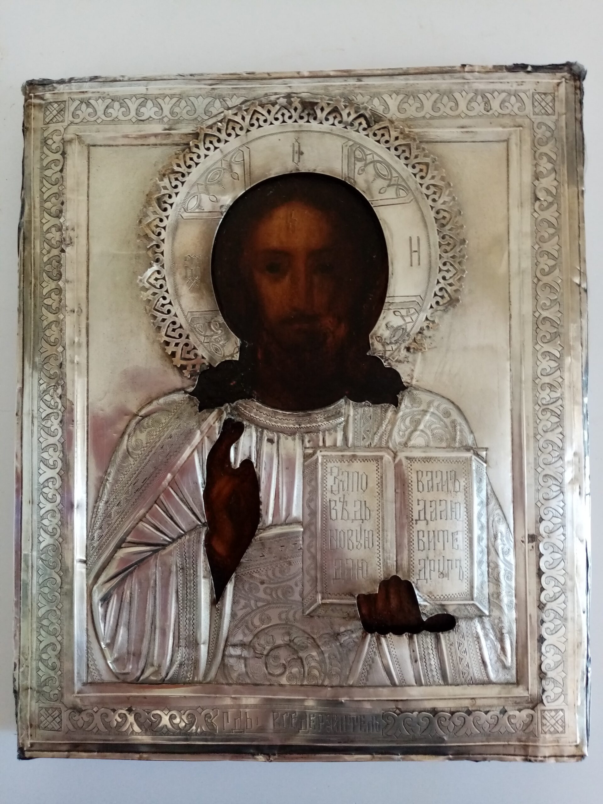 Annerimento dell’argento dovuto alla presenza di solfuri i cui prodotti di corrosione si presentavano in via di diffusione sul dipinto sottostante su tavola con la presenza di aree scure, attacco xilofago del supporto ligneo, fratturazioni e mancanze delle riza argentea, tela lacerata e lacunosa, pellicola pittorica annerita e sporca.
